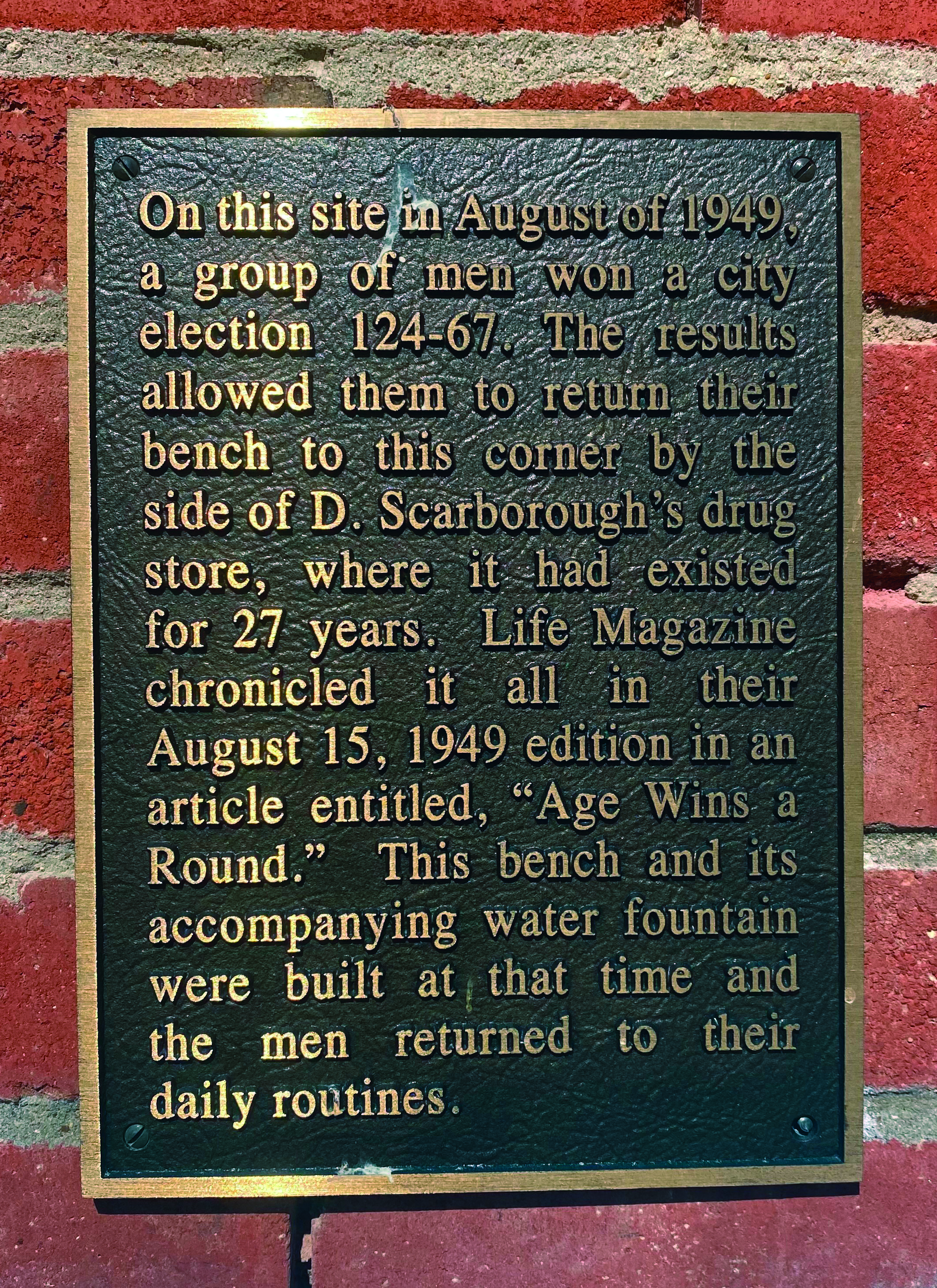 Any descendants of the “bench sitters” featured in the 1949 Life Magazine article are invited to contact Anne Chastain to participate in the planned photo of descendants sitting on the bench.