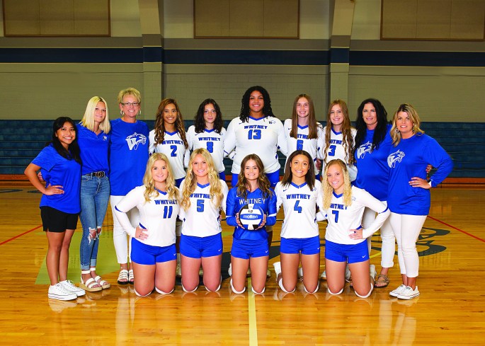 The Whitney High School varsity volleyball team has been warming up for the district schedule with scrimmages, games and tournaments this month. The Lady ‘Cats are scheduled to compete in the Valley Mills tournament this week. See a complete season schedule on the Wildcat Spirit Page on page 7. Pictured (l to r) are: front row – Laney Beam (senior), Caitlin Poore (junior), Alli McCreary (senior), K’Lea Fletcher (junior) and Emilie Booth (junior); back row – Vanessa Cruz (manager), Trinity Fergason (manager), Head Coach Tina Meadors, Caitlyn Panuco (senior), Caitlyn Hanna (junior), Jaycee Green (sophomore), Karley Tucker (freshman), Macy McKinney (senior), Coach Scarlette Baker and Coach Mindy Estill. Photo by Jennifer Gauer