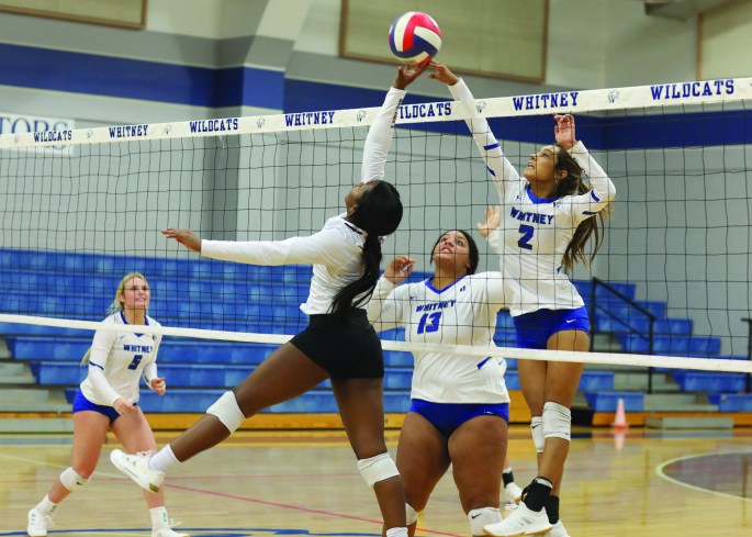 The Whitney High School varsity volleyball team defeated La Vega in all three sets (25-11, 25-15, 25-19) at home Friday, August 27. Pictured above at the net are #2 Caitlyn Panuco and #13 Jaycee Green. The Lady ‘Cats were scheduled to play Hillsboro at home Tuesday, August 31, before traveling to Robinson Friday, September 3. Next week’s schedule includes games in Connally and a home game against Reisel.