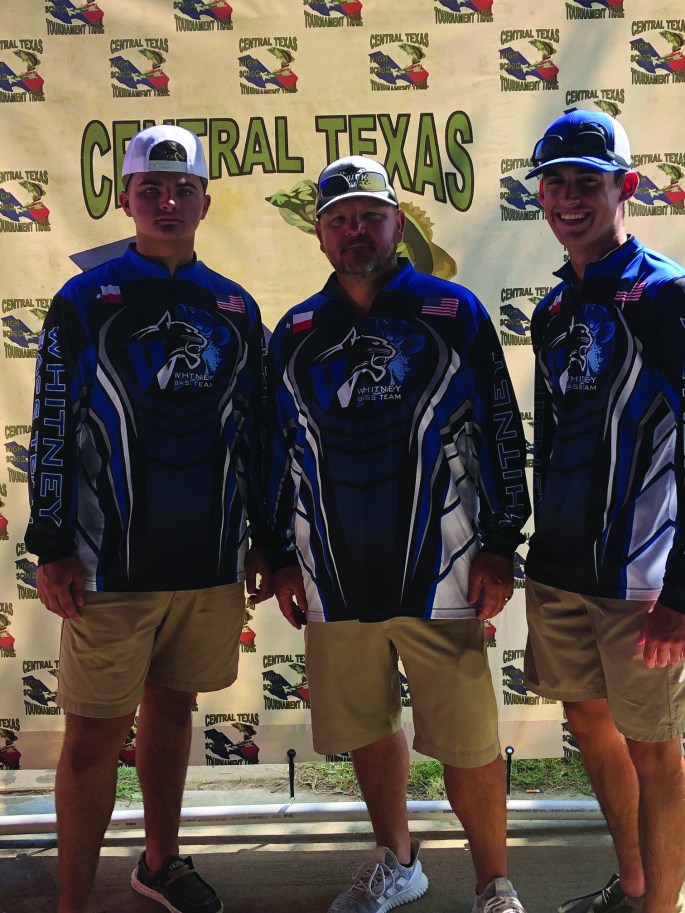 Whitney High School’s first fishing team competed in the Central Texas High School Tournament Trail at Lake Waco Sunday, September 19. The bass team is open to high school students, and those who join compete for scholarship opportunities and prizes. Whitney registered four female teams and two male teams. Boat captains include: James Ivers, Tyson Griffin, Roger Camp, Chris Fulton, Floyd Wolf and Adam Handy. Anglers include: Jared Ivers, Brayden Heath, Carson Griffin, Mason Seely, Danielle Ortiz, Jasmyn Britain, Bailey Fulton, Karley Tucker and Hope Ivers. Pictured above are angler Jared Ivers, boat captain James Ivers and angler Brayden Heath. They make up the first team to ever catch one fish with a scale of 1.75, leaving Whitney’s ranking at 32 out of 76 teams. Christi Ivers, school sponsor of the fishing team, would like to thank the team’s sponsors for their contributions.