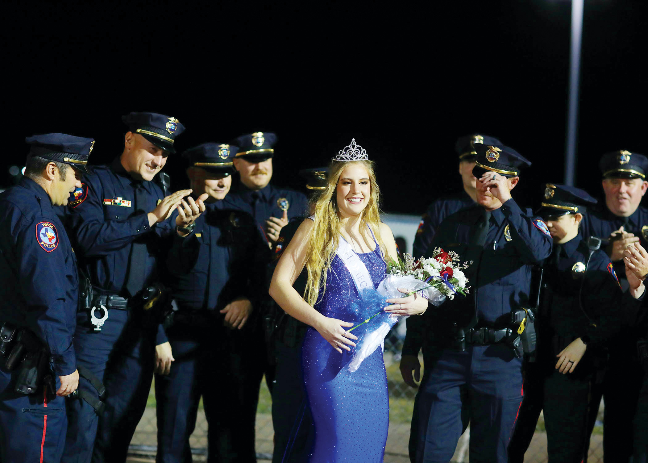 Whitney High School homecoming queen Macy McKinney was crowned during halftime ceremonies of the Wildcat football game Friday night, October 1. In a moving ceremony, Macy was escorted by members of the Waco Police Department as a tribute to her late father Michael McKinney, who was a Waco officer and passed away in December after battling cancer. “She is and forever will be a part of the Waco PD family, so we had to come out and support her,” the department announced in a statement. The homecoming queen was also escorted by her mother, April McKinney.
