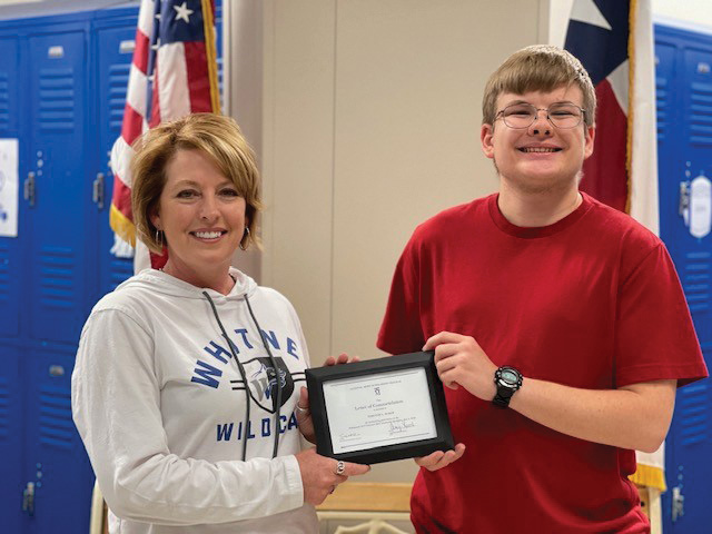Amy Leech, principal of Whitney High School, is pictured presenting a certificate to Timothy Baker for being named a commended student in the 2022 National Merit Scholarship Program for achieving scholastic excellence on his SAT. Approximately 34,000 commended students across the nation are being recognized for their exceptional academic promise. Commended students placed among the top 50,000 students who entered the 2022 competition by taking the 2020 preliminary SAT/National Merit Scholarship Qualifying Test.