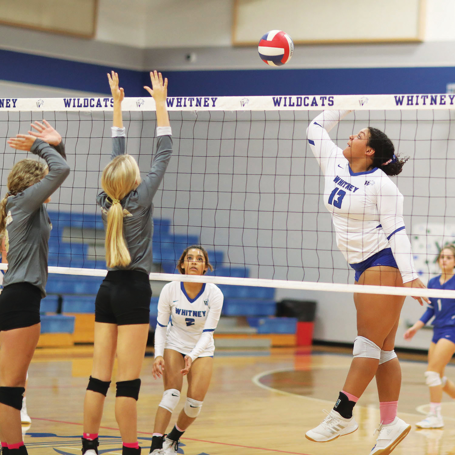 The Whitney High School varsity volleyball team defeated McGregor Friday, October 22. The Lady ‘Cats won in five sets (25-22, 18-25, 9-25, 25-14 and 15-11). Whitney will wrap up its season on the road against Waco Harmony Tuesday, October 26. Pictured is sophomore Jaycee Green at the net against McGregor.