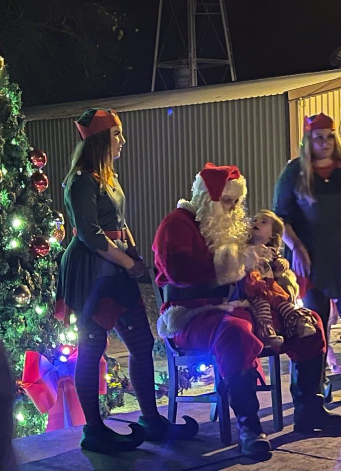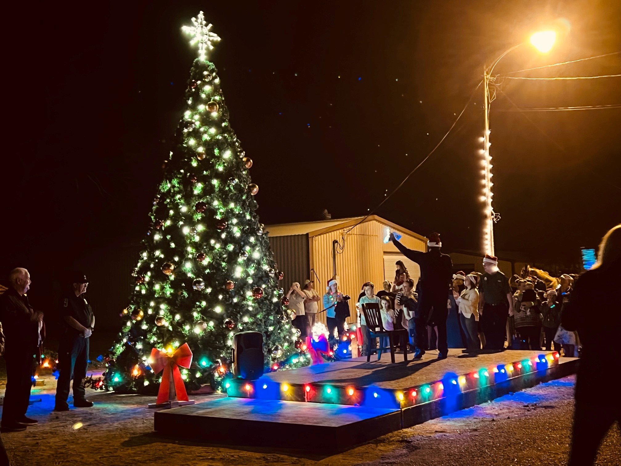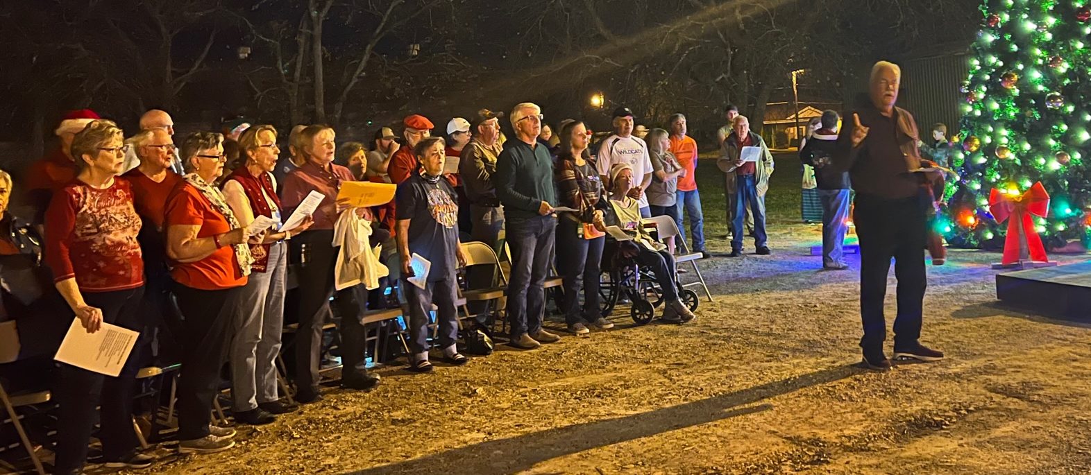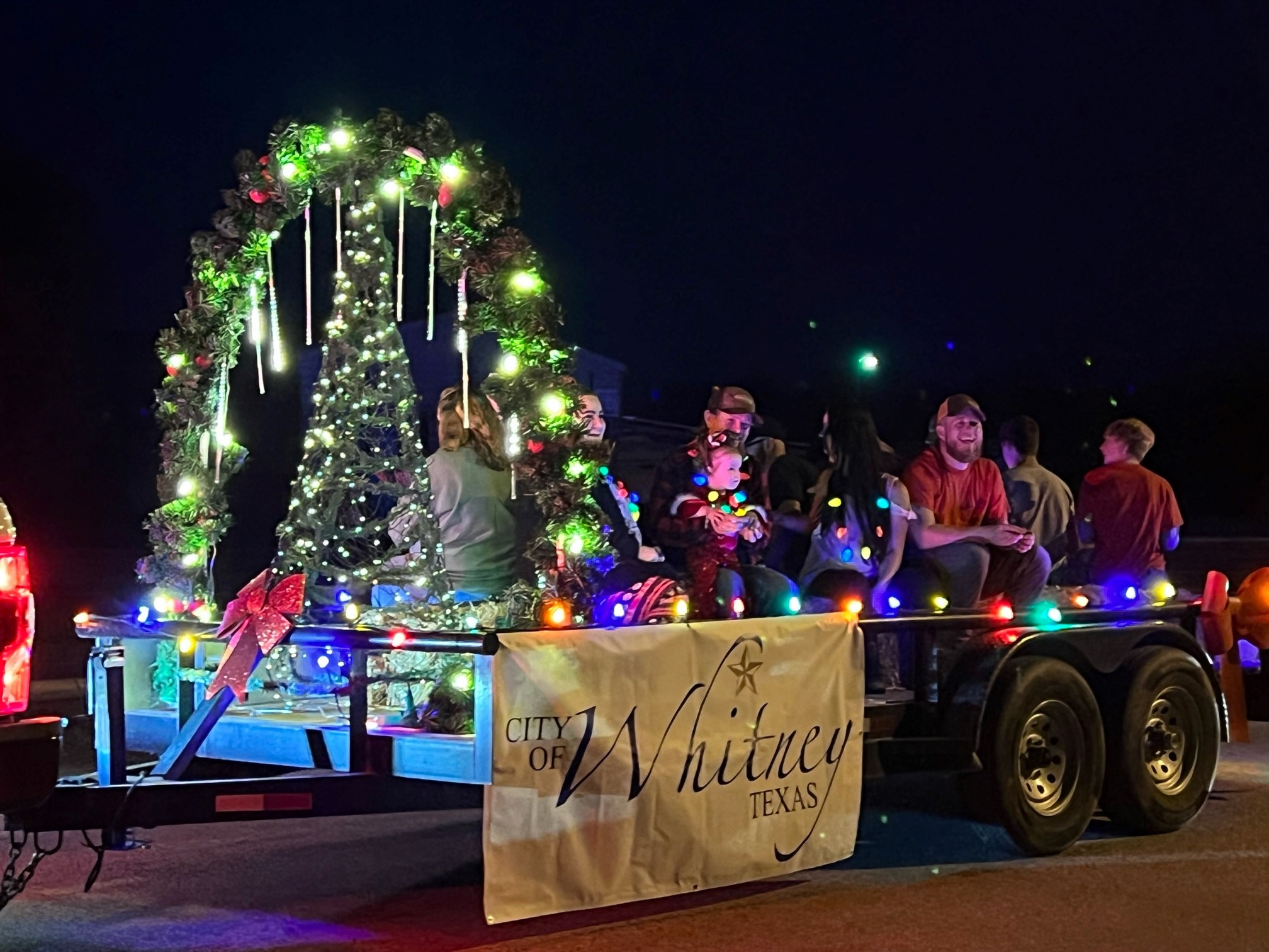 The City of Whitney got into the Christmas spirit with a parade followed by the lighting of the downtown Christmas tree Saturday night, December 4. Pictured above, Mayor Brad Slaten, introduced by City Administrator/Police Chief Chris Bentley, lit the tree. Following the tree lighting, holiday dance performances were provided by To The Pointe Dance Studio students and Whitney High School German Club Folk Dancers. The White Bluff Chapel choir (pictured at bottom) led Christmas carols around the tree, and at the end of the night, children lined up to have their pictures taken with Santa Claus.