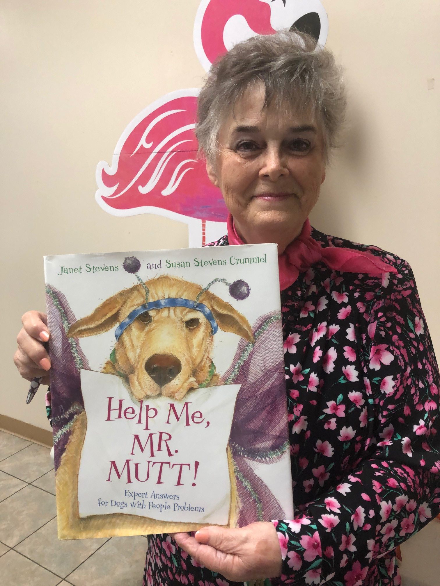 Members of the Page Turners Book Club have asked the retirees to meet with them to hear members of both groups present a Readers Theater of the children’s book, “Help Me Mister Mutt.” Susan Stevens Crummel wrote the book, which gives “expert answers for dogs with people problems.” Her sister, Janet Stevens, is the illustrator.