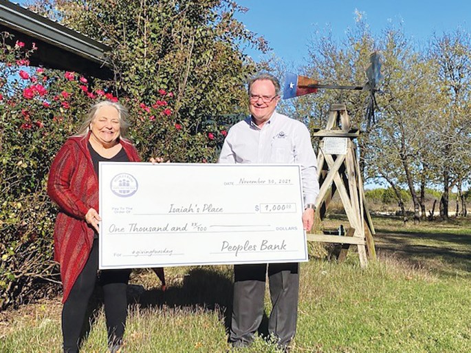 Peoples Bank participated in Giving Tuesday by presenting donations to several local non-profit organizations, including Isaiah’s Place of Whitney. Pictured is Isaiah’s Place Executive Director Diane Frederickson accepting a $1,000 donation. The announcement was made by Larry Allen, Chairman of the Board of Directors and Chief Executive Officer of Peoples Bank. Giving Tuesday is a day dedicated to bringing people together by spreading generosity and giving to local charities. More information about Isaiah’s Place is available at http://www.isaiahsplace.net.