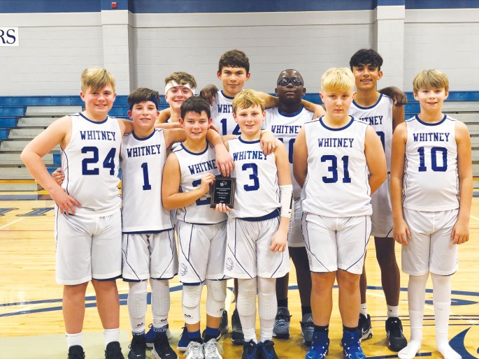The Whitney Middle School Seventh Grade “A” basketball team won the Whitney tournament held Saturday, January 8. Pictured are (l to r): front row – Colt Poore, Fisher Watson, Keegan Estill, Jaxon Landrum, Johnny Ayres and Rylan Smith; back row – Sean Warren, Kade McFadden, Jordan McGill and Leo Montes. Not pictured is Reed Schneider.