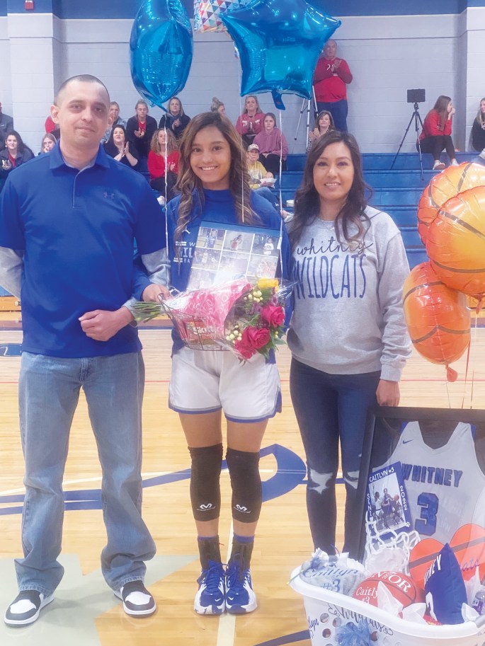 Caitlyn Panuco, a senior member of the Whitney High School varsity basketball team, is pictured with her parents, Juan and Diane, as she marked her last home game Saturday with a win against West. Panuco plans to attend either Texas State University or University of Mary Hardin-Baylor. The Lady Wildcats defeated West 47-43 Saturday, and the varsity boys narrowly lost their game against the Trojans by a score of 47-45.