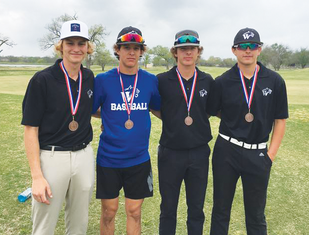 The Whitney High School varsity boys golf team recently finished third in district play. Members of the varsity team pictured above (l to r) are Rob Riney, Kannon Watson, Tate Winkler and Brendan Aguirre. Winkler and Riney will advance to regionals in Brenham April 18-19, after they each shot an 81 on the first round and an 85 on the second round at district. The junior varsity boys and girls earned first place as a team at district, and the varsity girls placed fifth.