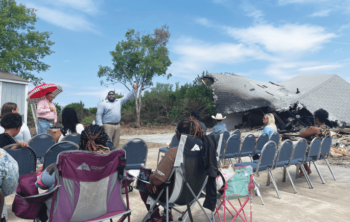 Members of the historic Pleasant Hill Missionary Baptist Church in Whitney had a painful week after their church building was destroyed in a suspicious fire late Sunday night, May 15, but by the next Sunday, they were meeting outdoors on the church grounds and vowing to pick up the pieces.