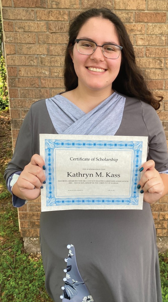 Hill County Master Gardeners recently awarded two scholarships of $1,000 each to two students. Christopher A. Wanat attends Tarleton State University in Stephenville and is majoring in horticultural and plant sciences. Kathryn M. Kass is attending Stephen F. Austin State University in Nacogdoches and majors in horticulture. Funds for these scholarships come from the Master Gardeners’ plant sales, and they appreciate all of the support received from Hill County residents