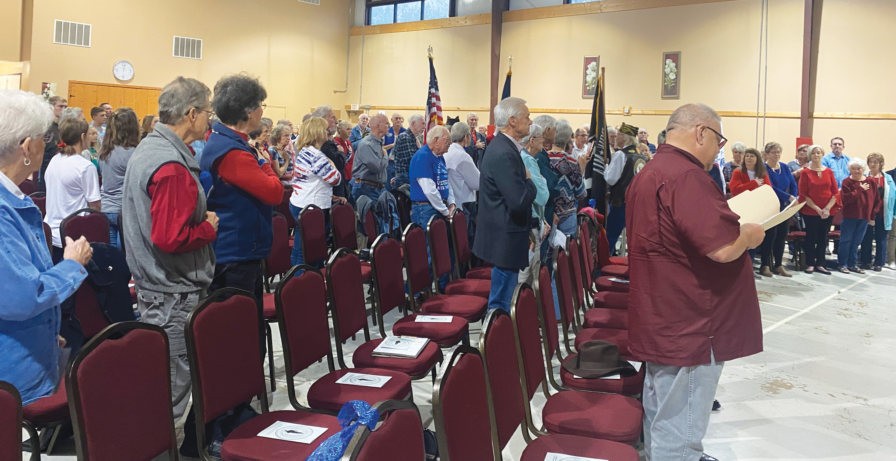 A Veteran’s Day event was held at 11 a.m. Friday, November 11, at The Lake Whitney Senior Center. The ceremony began with the Presentation of The Colors, completed by members of American Legion Post 522 and Veterans of Foreign Wars Post 12176, both of Whitney. In attendance were representatives of District 29 VFW Auxiliary, the DAR and Heart of Texas Blue Star Mothers.The Whitney High School Jazz Band plays patriotic tunes of the World War II Era. The band also played the anthems for the Army, Navy, Air Force and Marine Corps, and veteran audience members stood and sang along when the band played the anthem of the branch that they served in. Another musical performance was the White Bluff Chapel choir singing a patriotic choral medley, directed by Chapel Minister of Music and Family Aaron Franklin. At left, Debbie Gregory presented the Missing Man Exhibit. Gregory, the secretary of District 29 VFW Auxilary, said that the exhibit accompanied by an empty chair represents those missing from home. Gregory said, “Even though the initial purpose of the missing person table ceremony was to honor those missing in action and prisoners of war, it can also honor all those missing from home. Those who are still serving, who are still serving or fighting overseas, on foreign soil, are missing from home. Those who have been injured and are in hospitals throughout the world are missing from someone’s home. Those who gave the ultimate sacrifice will always be missing from home.”