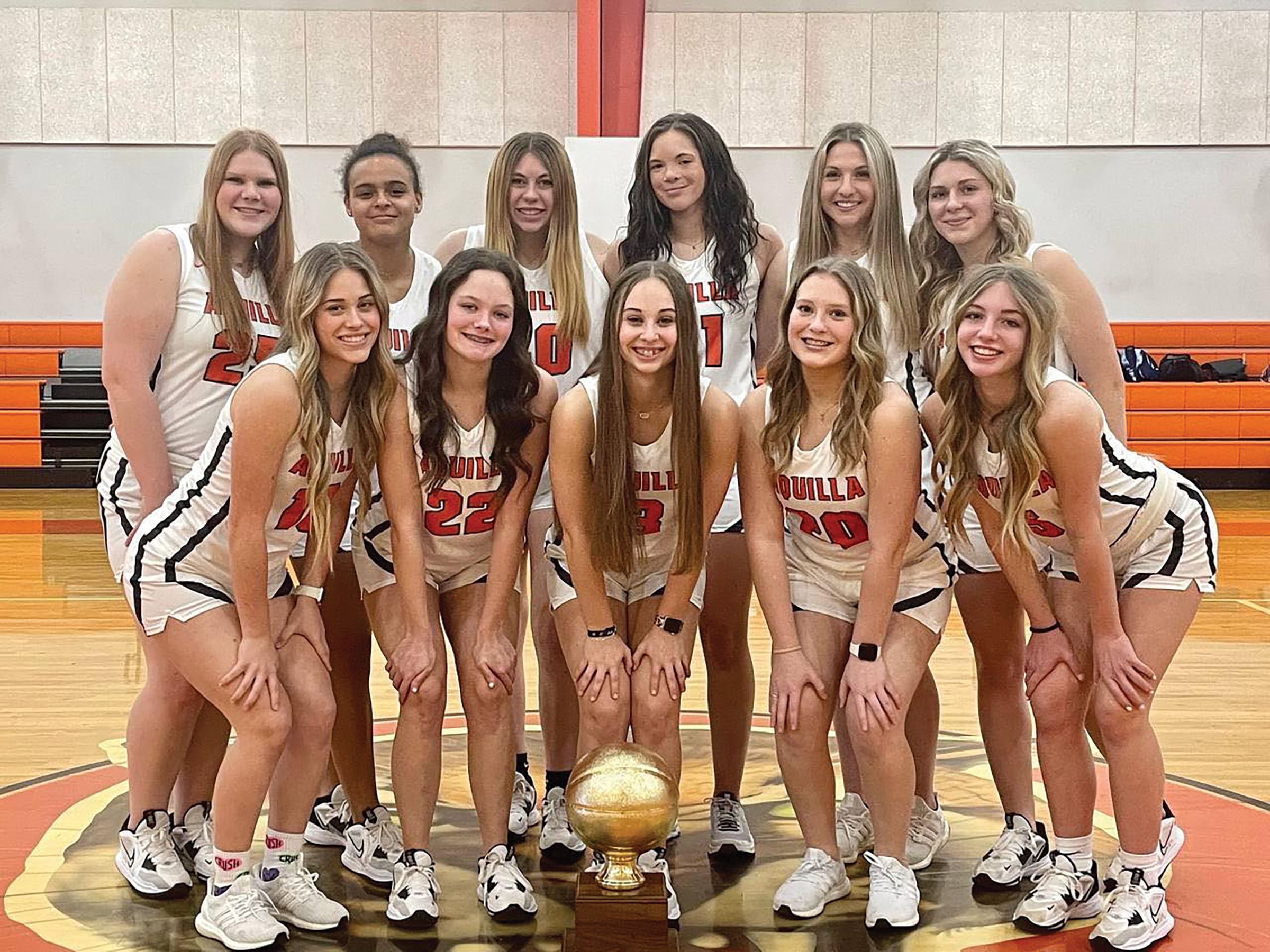 The Aquilla High School varsity Lady Cougars basketball team won their district championship last week with a 10-0 record. The undefeated team was set to take on Penelope in the bi-district round of the playoffs Monday, February 13. The results were unavailable as of The Lakelander’s press time. Pictured (l to r) are: front row – Addison Harwell, Kassidee Willbanks, Ava Harwell, Harper Hammonds, Lily Warren; back row – McKenley Roden, Sadie Wilson, Chyenne Allen, Makayla Bowman, Abigail Huffhines, Morgan Gerik. Not pictured is team member Raley McCurdy. The girls’ head coach is Alix Humphries, Payton Casarez is assistant coach, and Hannah Lewis is the team’s manager.