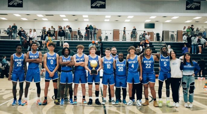 The Whitney High School varsity boys basketball team (10-2) sealed the district championship with a 67-66 win over Grandview Tuesday, February 7. Pictured are (l to r): Duan Johnson, Marcus Wilson, Jairdyn Anderson, Tristan Wilson, Eli Headley, Cade Baker, Colby Estill, Weazle Johnson, Mason Seely, Trey Haynes, Jordan Johnson. Pictured with the basketball players are coaches Joe O’Hearn, Randy Loggins and Joe Williams. Playoffs are set to start next week, and game information was unavailable as of press time.