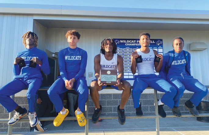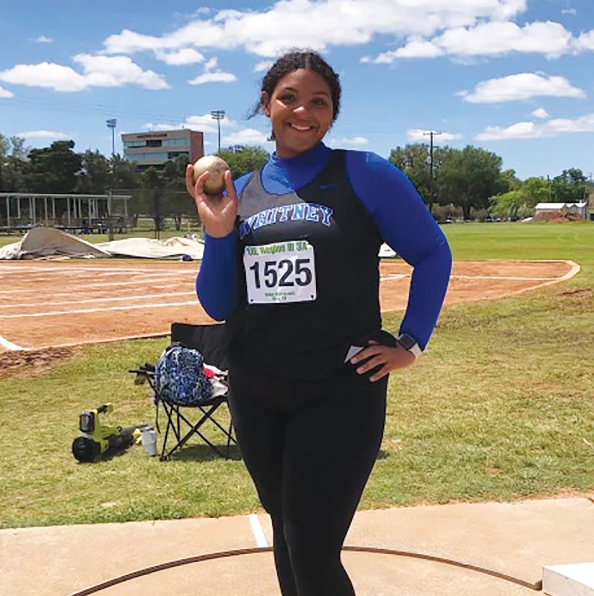 Several Whitney High School athletes are headed to state after competing at the Region III 3A Track and Field Championship in Hewitt April 28-29. Boys advancing to the state meet pictured (l-r) are regional long jump champion Jordan Johnson and the 400m relay champion team of Jairdyn Anderson, Tristen Wilson, Marcus Wilson and Duan Johnson. Marcus Wilson also qualified in the 300m hurdles. Jaycee Green, below, will be representing Whitney as the Region III 3A champion in shot put. The State Track and Field Championship will be held at Mike Myers Stadium in Austin Thursday, May 11.