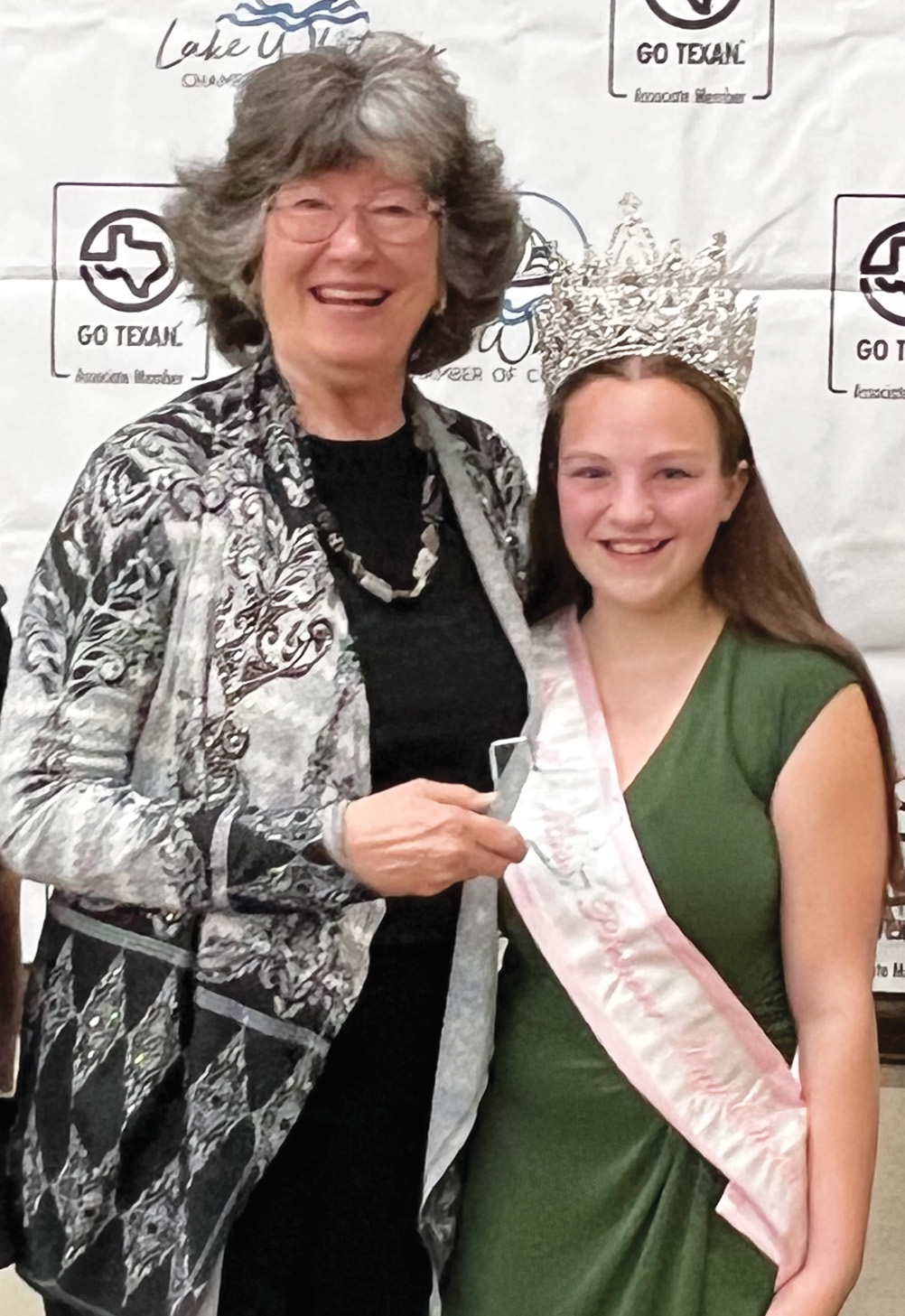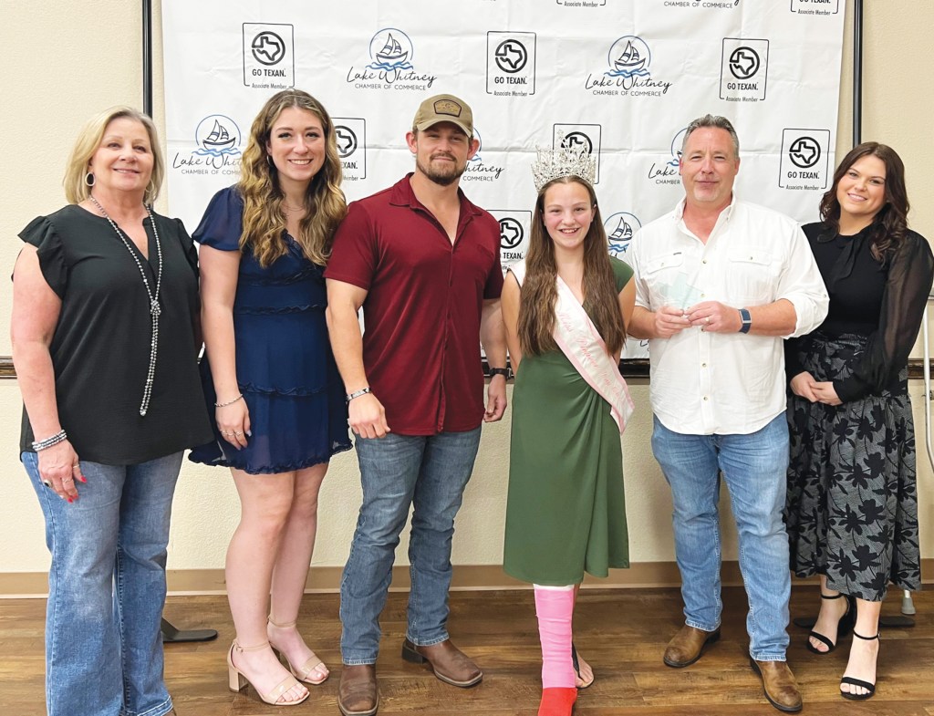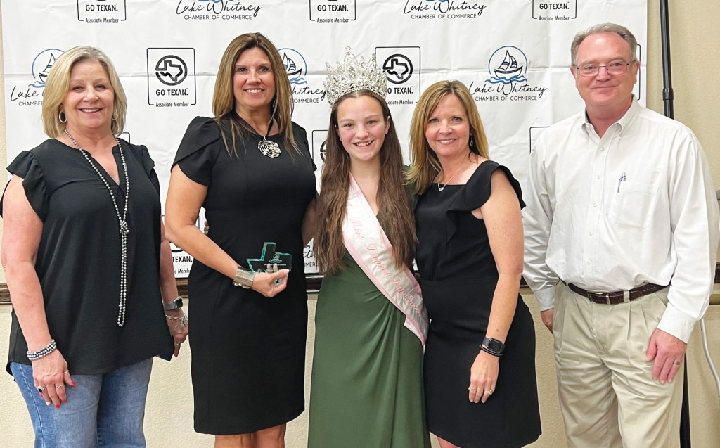 This year’s Hall of Fame Award was presented to Bill Winkleman, a longtime supporter of the Whitney community. Winkleman formerly served as president of First National Bank in Whitney and was a member of the bank’s board of directors for many years. He has been a community volunteer for decades, spending time at hospitals and nursing homes, delivering Meals on Wheels, working with the Lake Whitney food bank, supporting youth at the county livestock show, and serving on numerous boards and committees. Mr. Winkleman is pictured third from right with his family members and nominator Tricia Shelton.The Young Person of the Year Award went to Whitney High School senior Rylann Hensley. She was recognized as an exceptional student and community member, maintaining a 4.0 grade-point average while completing 48 hours of dual-credit college classes and over 80 hours of community service this year. She is pictured at right with her mother and WHS Principal Kendra Hensley (left).The Citizen of the Year Award went to Terry Boyer, who was recognized as a supporter, advisor and advocate for the Lake Whitney area. Boyer has served on multiple community service boards and spends time working to promote businesses and tourism in the area. She also maintains a community calendar to encourage involvement from citizens and businesses. Boyer is pictured at left with Jr. Miss Pioneer Day Alysa Ward (right).The Educator of the Year Award went to Sally Hayes, who teaches English at Whitney High School and has taken on volunteer roles outside of her teaching position. Hayes organizes student volunteer efforts on her own time and heads up mock interview sessions for seniors to help prepare them to enter the workforce. Pictured are (l to r): presenter Connie Terry, Hayes, Jr. Miss Pioneer Day Alysa Ward, WHS Principal Kendra Hensley and presenter Jayson Lam.The Chamber Member of the Year Award went to MyTCoat, a commercial outdoor furniture manufacturer in Whitney. The locally owned, veteran-operated business has donated benches and picnic tables to multiple schools and cities in the area and was recognized for providing top-notch products and services.