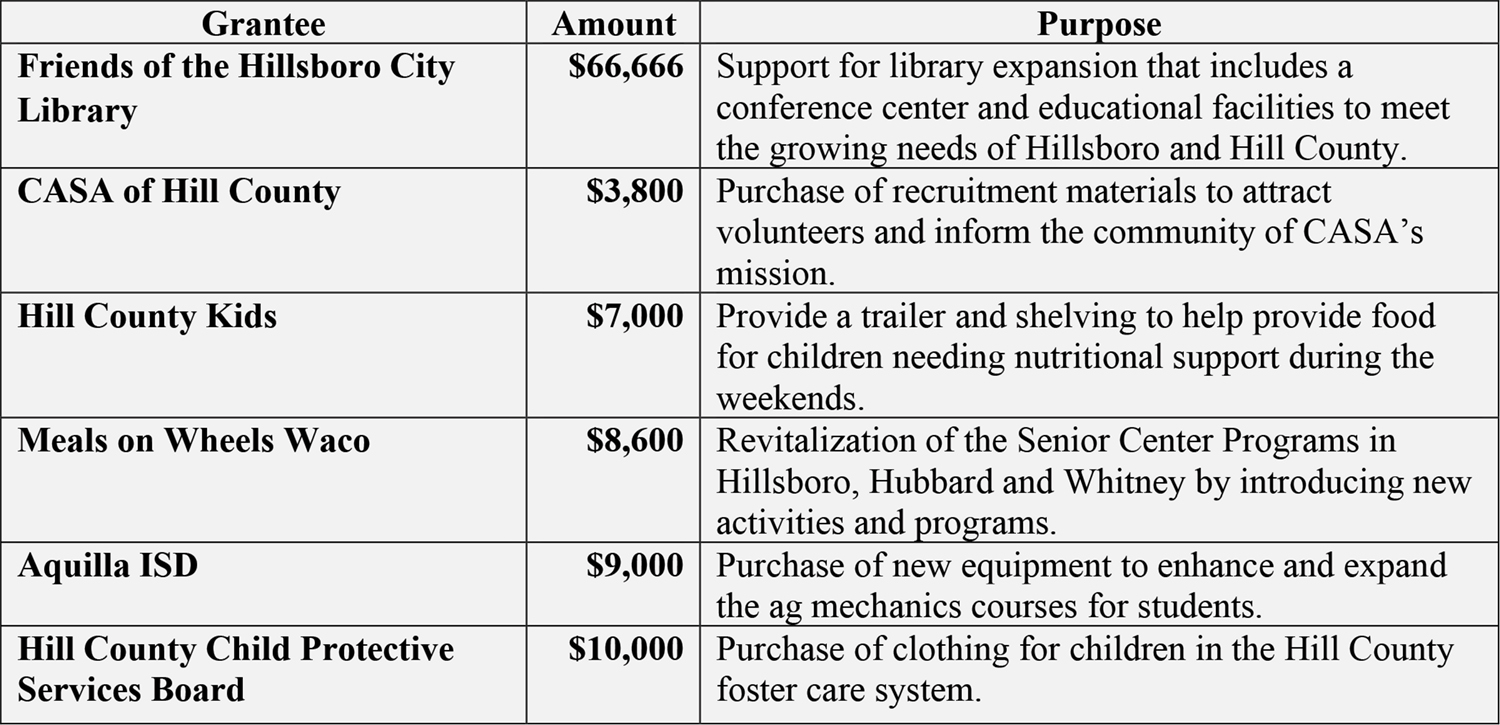 This year’s grants were awarded to a variety of educational, community service and social service organizations for projects consistent with the foundation’s mission to enrich the lives of Hill County citizens. Grant amounts ranged from $3,800 to $66,666.