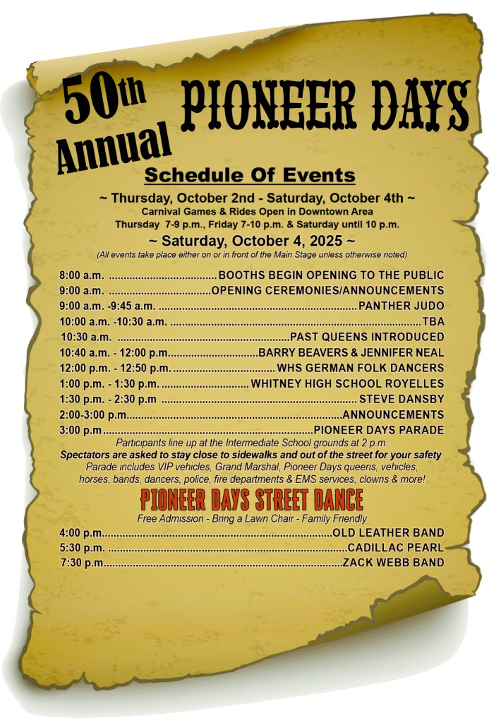 Performances get underway at 9 a.m. with Panther Judo. Past Pioneer Days queens will be introduced at 10:30 a.m., and local favorites Barry Beavers and Jennifer Neal will perform from 10:40 a.m. to noon. The Whitney High School German Folk Dancers will perform at noon, and the Whitney High School Royelles will follow with a performance at 1 p.m. Steve Dansby will perform at 1:30 p.m.